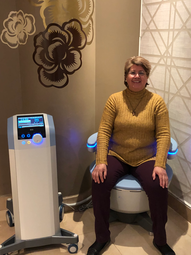 Usamos la tecnología de vanguardia. Es una silla diseñada específicamente para fortalecer los músculos del piso pélvico, rehabilitarlos y reeducarlos, generando contracciones supramaximas que en tan solo media hora emiten la energía equivalente a realizar 11,200 ejercicios de KEGEL.